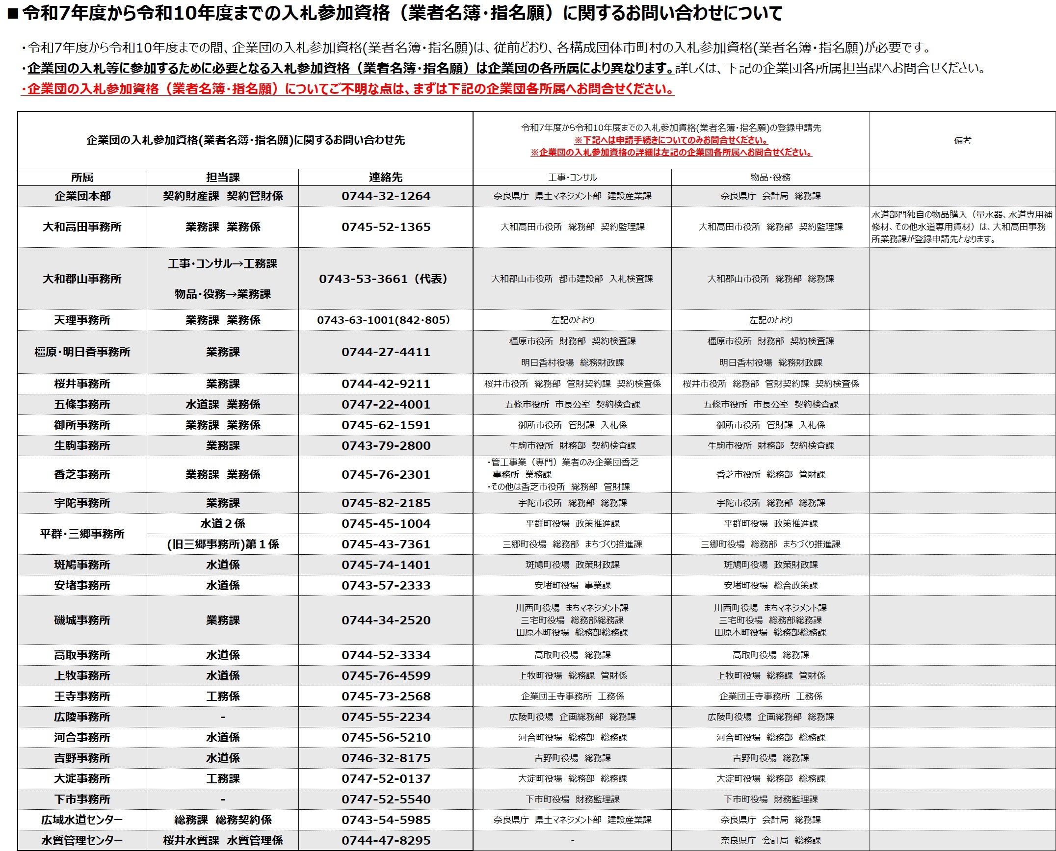 奈良県広域水道企業団の各所属が行う入札等の参加に必要となる入札参加資格につきましては、令和7年度から令和10年度の間は、従前どおり、企業団の各構成団体市町村等の入札参加資格(業者名簿・指名願)があることが要件となります。
